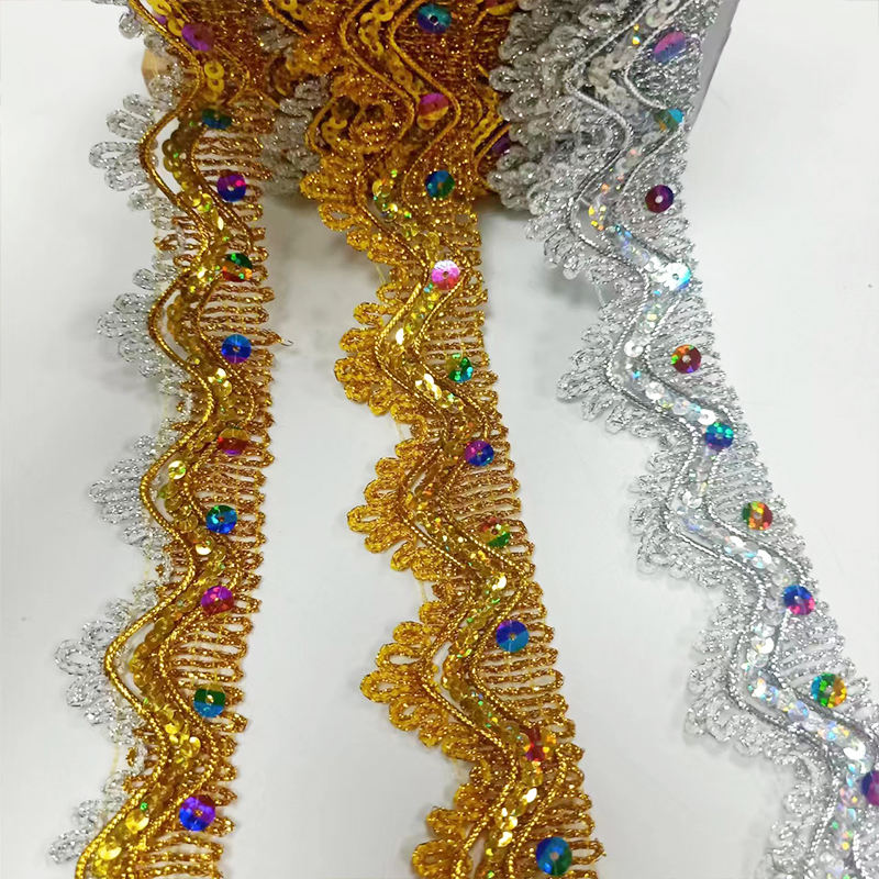 Akcesoria odzieżowe Złote i srebrne metalowe granice koronkowe wielokolorowe cekina złota nić metaliczne koronkowe wykończenie dekorowane złotymi i srebrnymi dwukolorowymi drutami metalowymi oraz siedmiokolorowymi cekinami, tworzy wspaniały i olśniewający efekt obrzeża. Jest odpowiedni do dekoracji mankietów, kołnierzy i obrotów z wysokiej klasy odzieży, takich jak suknie wieczorowe, kostiumy sceniczne i sukienki ślubne. Materiał jest lekki i elastyczny, nie zanika ani pigułki, i obsługuje niestandardową szerokość i wzory, dodając luksusowy połysk do odzieży.
